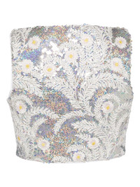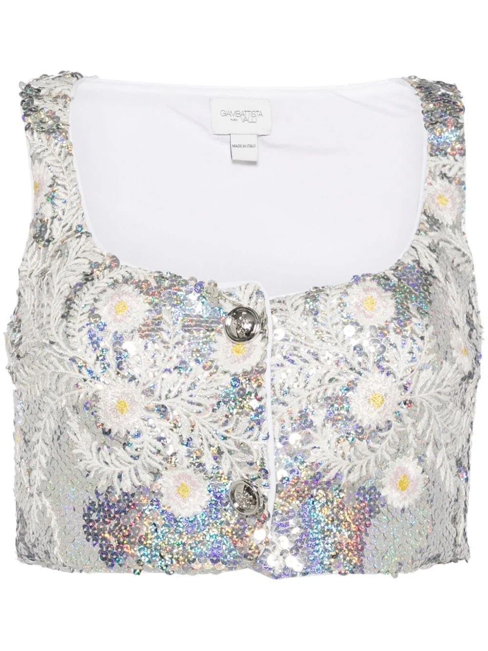 sequined crop top Highlights - Silver-tone/multicolour - Sequin embellishment - All-over floral embroidery - Round neck - Front press-stud fastening - Sleeveless - Cropped - Straight hem Made in Italy Composition Body: Polyester 100% Base: Viscose 97%, Elastane 3% Lining: Acetate 75%, Silk 25%