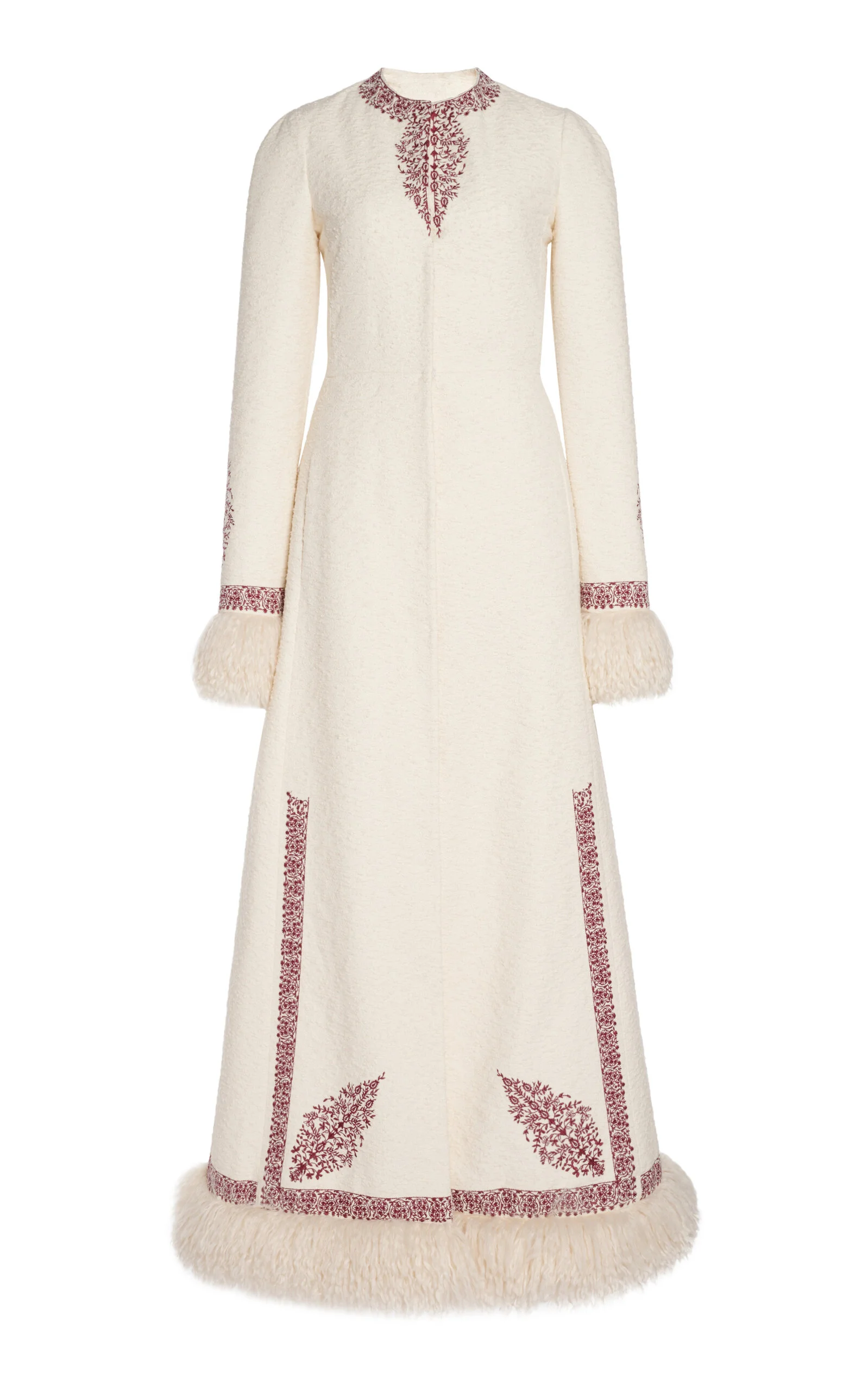 PRODUCT DETAILS - Featured on the Fall/Winter '24 Runway - Slim fit, crewneck, collarless, long sleeves with shearling cuffs, shearling-trimmed hem, embroidery details at neckline, cuffs, and hem - Unlined - Color: ivory - Snap fastening through front - Made in Italy