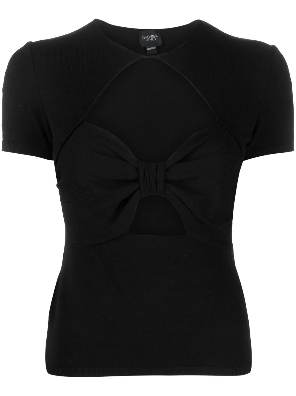 cut-out short-sleeve top Giambattista Valli continues to express its elegant aesthetic, as shown on this short-sleeve top for AW23. Rendered in black, it boasts a bow-shaped cut-out at the front for a romantic finish. Highlights - Black - Crew neck - Cut-out detailing - Short sleeves - Short sleeves - Straight hem Made in Italy Composition Viscose 70%, Polyester 30% SIZE & FIT Model measurements Height 5 ft 10 in(1.78 m) Bust/Chest 31.49 in(80 cm) Hips 36.22 in(92 cm) Waist 25.59 in(65 cm) FittingInformation Designed for a close fit throughout Made with a midweight knit, this piece offers some stretch This piece fits true to size – take your usual size