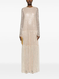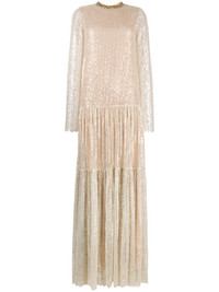 tiered sequinned gown Timelessly elegant, this gown exemplifies GIAMBATTISTA VALLI's opulent aesthetic. It's crafted in France with a delicate tiered skirt and is adorned with shimmering sequins that create a captivating interplay of lights. Highlights - Gold-tone - Semi-sheer overlay - Sequin design - Crew neck - Long sleeves - Concealed rear zip fastening - Tiered skirt - Long length Made in France Composition Viscose 50%, Nylon 30%, Acetate 20% SIZE & FIT Model measurements Height 5 ft 11 in(1.8 m) Bust/Chest 32.67 in(83 cm) Hips 36.22 in(92 cm) Waist 24.4 in(62 cm) FittingInformation Designed for a relaxed fit, this piece allows for comfort and movement when worn Made from a midweight non-stretch fabric This piece fits true to size – take your usual size Washing instructions Dry Clean Only