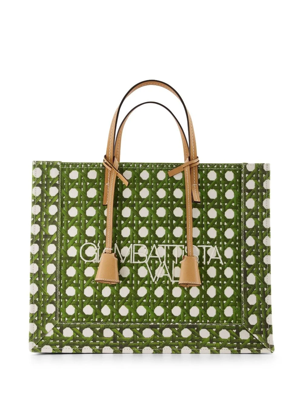 woven-print canvas tote bag Giambattista Vali showcases a playful side with this tote bag, printed with a woven lattice design for a trompe loeil effect. The canvas tote is finished with leather handles and detailing for an elevated touch. Highlights - Forest green/camel brown - Cotton - Canvas - Leather trim - Lattice pattern print - Embroidered logo to the front - Two flat top handles - Padlock detail - Main compartment Made in Italy Composition Leather 100%, Cotton 100% SIZE & FIT Measurement DEPTH 5.51 in(14 cm) HANDLE 5.11 in(13 cm) HEIGHT 11.02 in(28 cm) WIDTH 13.77 in(35 cm) Washing instructions Do Not Wash/Do Not Dry Clean