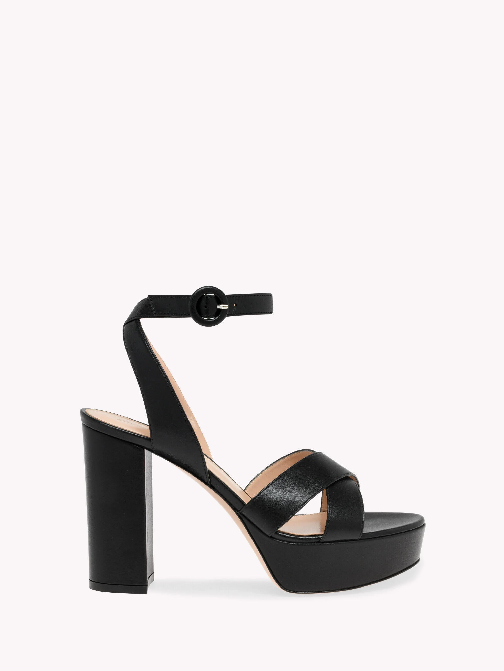 Crafted from leather, Sabrina is a round toe sandal with a 35mm platform and a 105mm chunky heel. The ankle strap is adorned with a round buckle. Handmade in Italy. - Composition: 100% NAPPA - Heel Height: 2.8 inches / 70 mm - Model Code: G32621.70RIC Item ID: G32621.70RIC.NAPNERO
