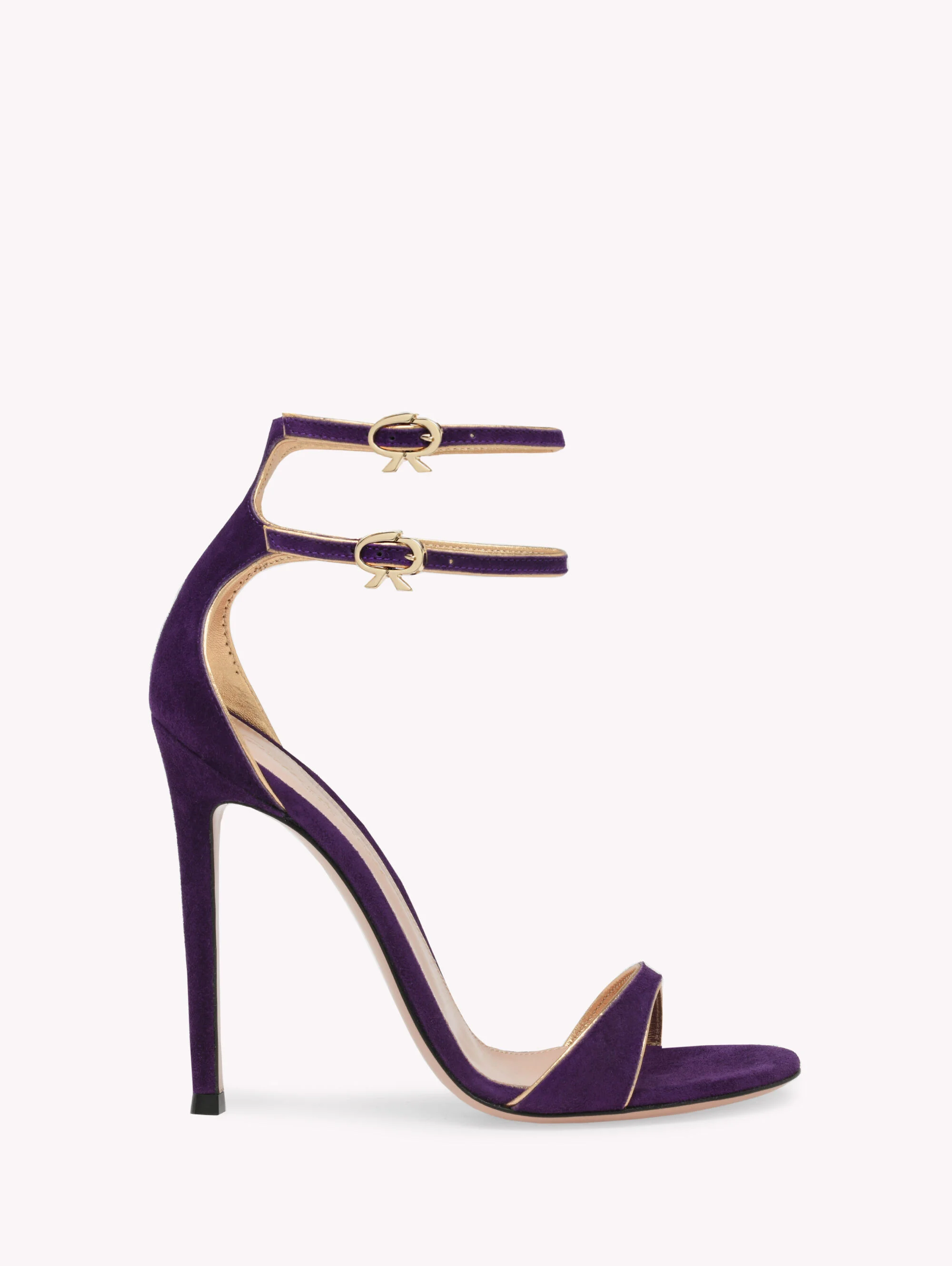 Crafted from suede, Victorine is a round toe sandal with a 115mm stiletto heel. The upper is defined by metallic-effect gold leather piping inspired by Art Deco. The ankle straps are enriched with the Maison's signature Ribbon buckle. Handmade in Italy. - Composition: 100% SUEDE - Heel Height: 4.5 inches / 115 mm - Model Code: G61753.11RIC Item ID: G61753.11RIC.XCKPUME
