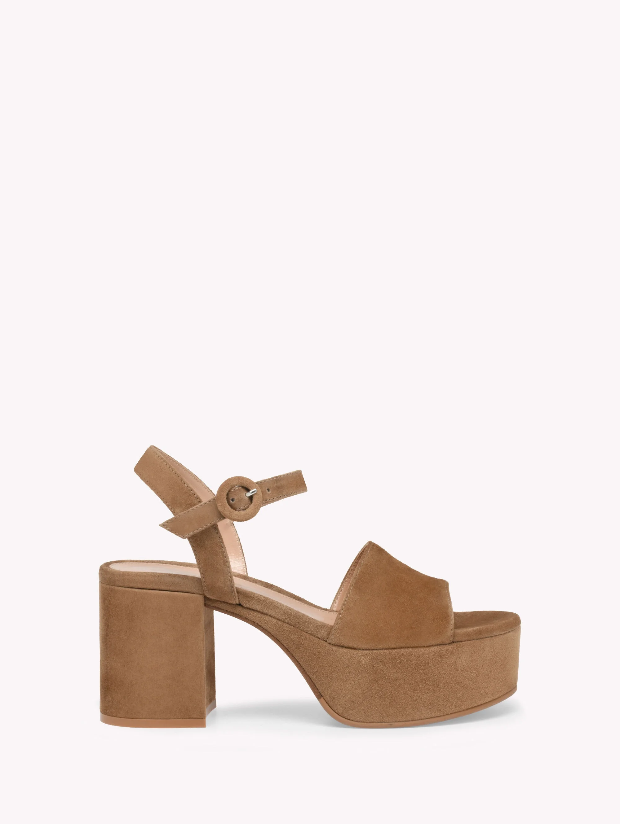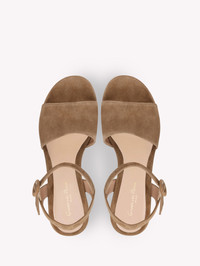 Crafted from supple suede, Carol is a round toe sandal with a 40mm platform and a 75mm block heel. The ankle strap is finely adorned with a leather-covered round buckle. Handmade in Italy. - Composition: 100% SUEDE - Heel height: 1.4 inches / 35 mm - Model Code: G32684.35RIC Item ID: G32684.35RIC.CAMCAML