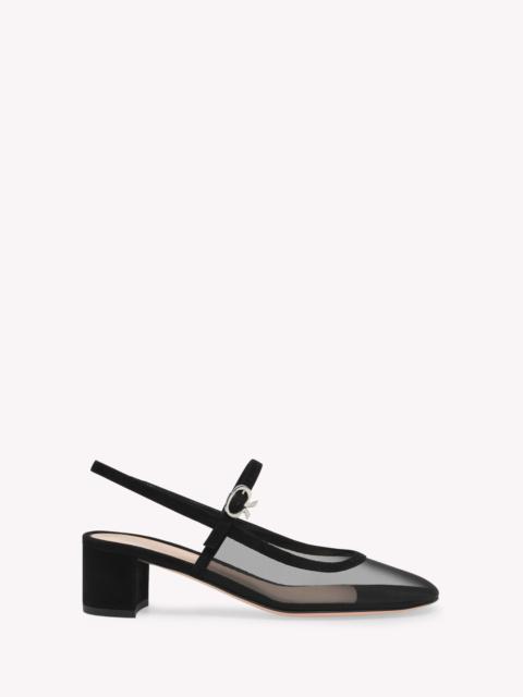 Crafted from see-through mesh fabric and supple suede, Francoise is a round toe Mary Jane slingback with a 45mm block heel. The front strap is embellished with the signature Ribbon buckle. The leather-covered back strap presents an inside elastic to help with the fit. Handmade in Italy. - Composition: CATE - Heel Height: 1.8 inches / 45 mm - Model Code: G95574.45RIC Item ID: G95574.45RIC.RSCRYRY