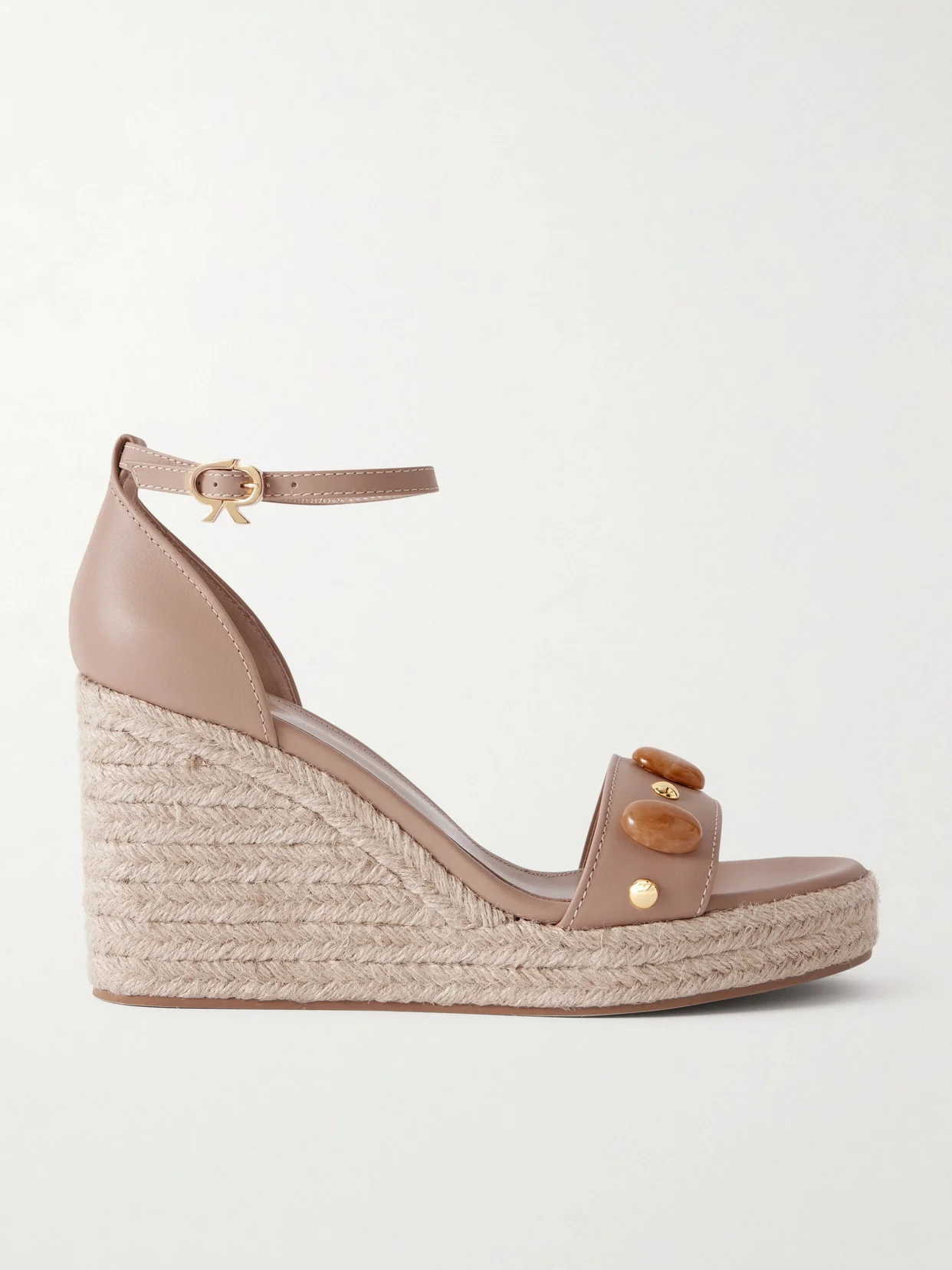 Gianvito Rossi's sandals are embellished with polished stones and gold-tone studs for a chic, bohemian feel. Handcrafted in Italy from leather, they have rounded open toes and jute wedge soles that offer plenty of lift. The ribbon buckle is a house signature.