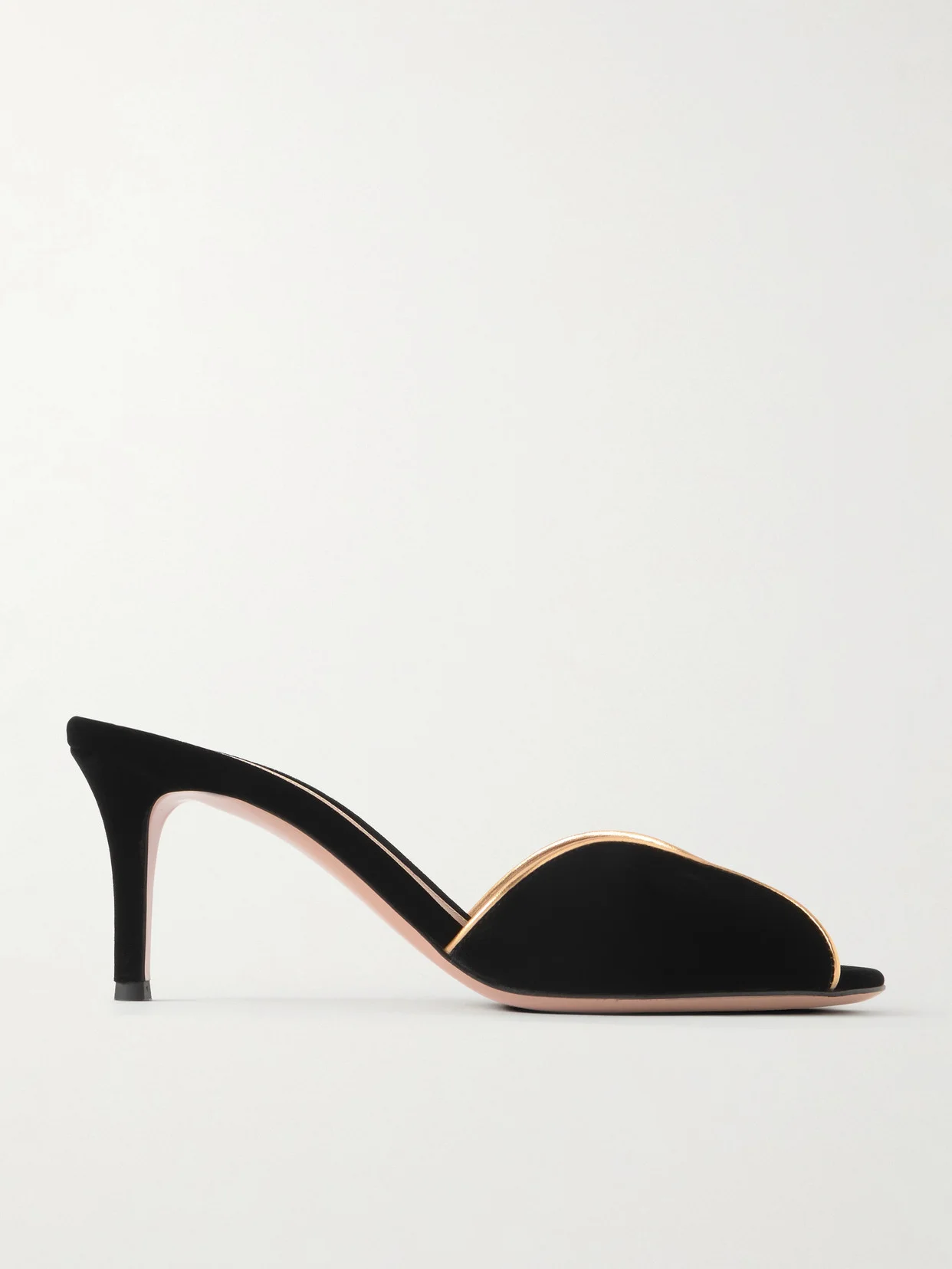 Each pair of Gianvito Rossi's shoes has been individually handcrafted in Italy using techniques that the brand has perfected over time. A beautiful example, these mules are made from plush black velvet with 70mm heels and gold leather trims that outline the curved vamps and peep toes. Small to size. See Size & Fit notes.