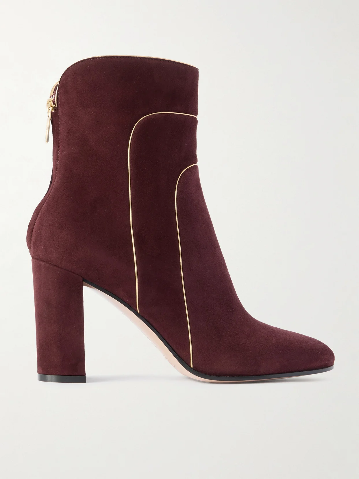 Gianvito Rossi's ankle boots are made from burgundy suede and traced with gold leather piping throughout. They're set on 85mm block heels that offer the perfect amount of lift.