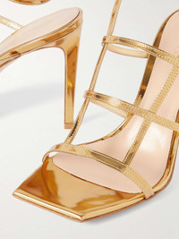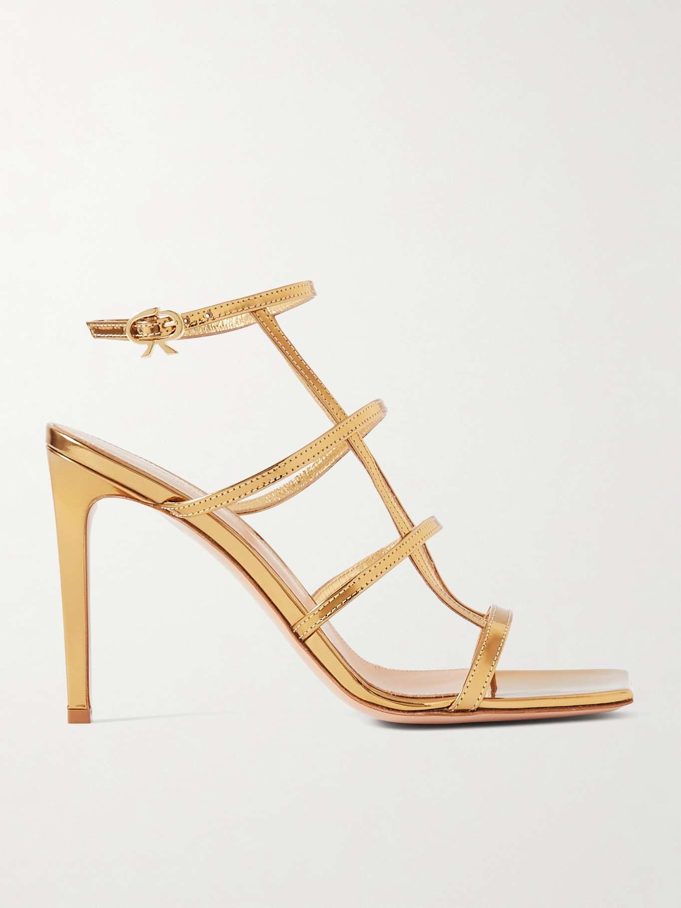 Gianvito Rossi's sandals are made from strips of lustrous gold leather that frame your foot with a cage-like design. They're set on 95mm stiletto heels and have square toes. The signature bow-shaped buckle adjusts the fit. Size & Fit - Fits true to size, take your normal size - Italian sizing Details & Care - Heel measures approximately 95mm/ 4 inches - Gold metallic leather (Lamb) - Buckle-fastening ankle strap