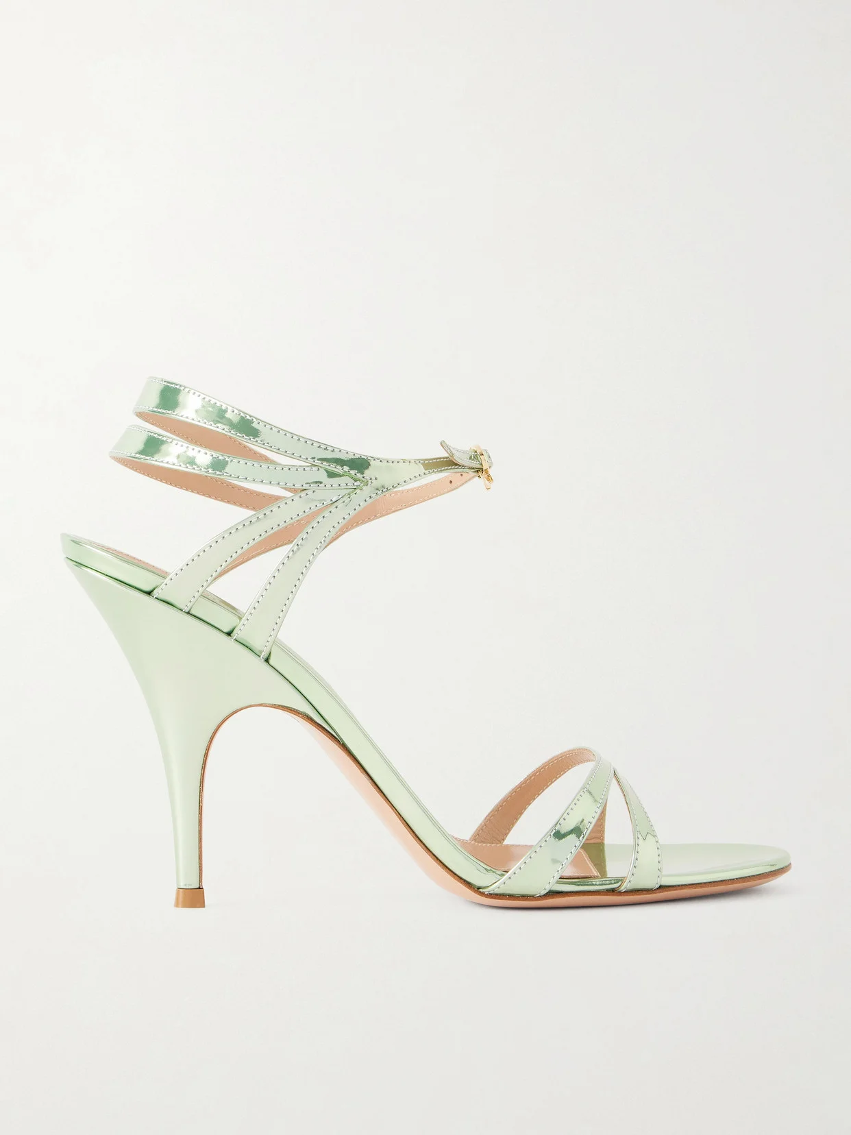 Gianvito Rossi's elegant sandals have been crafted in Italy from leather with a gleaming, mirrored finish. Designed with several foot-framing straps, they have a neat-logo embellished ankle strap that sits front and center. Pair them with evening dresses to dial up the glamour. Small to size. See Size & Fit notes.