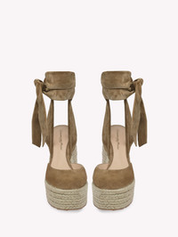 Arenella is a round toe d'Orsay espadrille with two ankle tie soft wide straps. The wedge, which measures 50mm on the front and 120mm on the back (the perceived height is 70mm), is covered in natural rope and finished with a rubber sole. Handmade in Italy. - Composition: 100% SUEDE - Heel height: 70 - Model Code: G95496.70RIC Item ID: G95496.70RIC.CDJCMNA