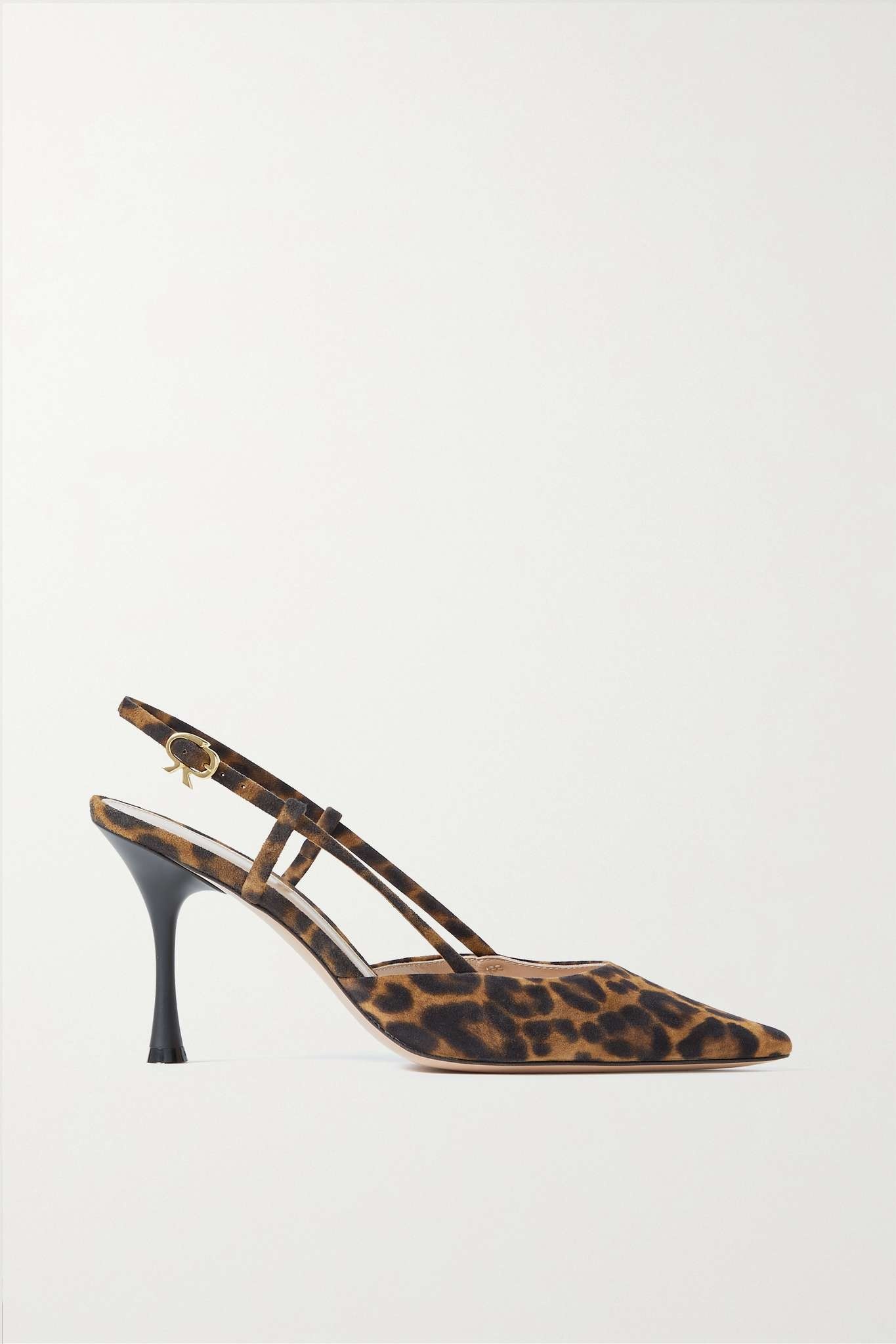 EDITORS'NOTES Gianvito Rossi's 'Ascent' pumps are designed with slim slingback straps that adjust with the label's gold-tone buckle resembling a bow. They've been made in Italy from leopard-print suede in a point-toe silhouette and have fluted 85mm heels. Wear yours with cropped tailoring or midi dresses. SIZE & FIT - Fits true to size, take your normal size - Italian sizing DETAILS & CARE - Heel measures approximately 85mm/ 3.5 inches - Leopard-print suede - Buckle-fastening slingback strap