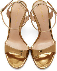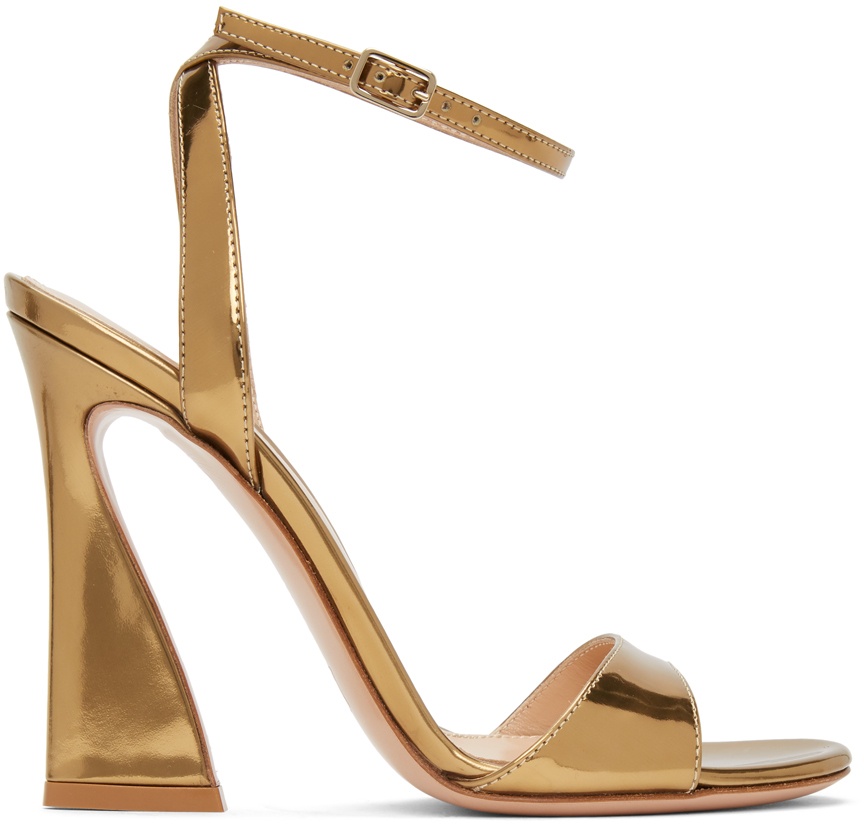 Patent calfskin leather heels in gold-tone. Open round toe. Ankle strap with adjustable pin-buckle fastening. Logo stamp in gold-tone at beige leather footbed. Covered curved heel. Leather sole in beige. Pale gold-tone hardware. Approx. 4" heel. Supplier color: Mekong gold