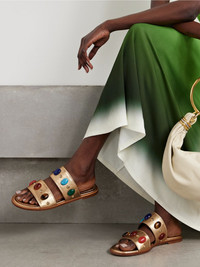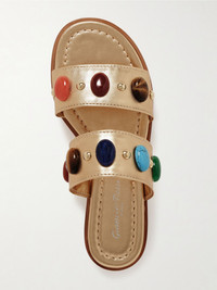 Gianvito Rossi's slides are embellished with polished studs and colorful cabochons inspired by chakra stones - the detail gives them such an elevated feel. They've been made in Italy from metallic leather and have padded footbeds for comfort. Size & Fit - Fits true to size, take your normal size - Italian sizing Details & Care - Slight heel - Gold leather (Sheep) - Slip on