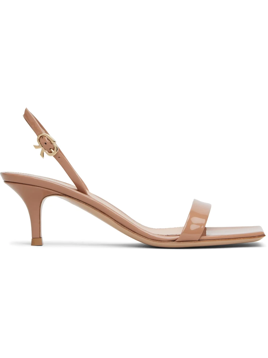 Handcrafted patent calfskin heeled sandals. · Open square toe · Strap at vamp · Logo hardware at pin-buckle slingback strap · Logo stamp at padded leather footbed · Covered kitten heel with rubber injection · Polished leather sole · Heel: H2" Supplier color: Praline Upper: calfskin. Sole: leather, rubber. Made in Italy 252090F125001