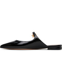 Polished leather Mary Jane-style slip-on loafers in black. · Pointed toe · Logo hardware at pin-buckle strap · Logo stamp at padded leather footbed · Covered block heel with rubber injection · Polished leather sole Supplier color: Black Leather. Made in Italy 252090F118004