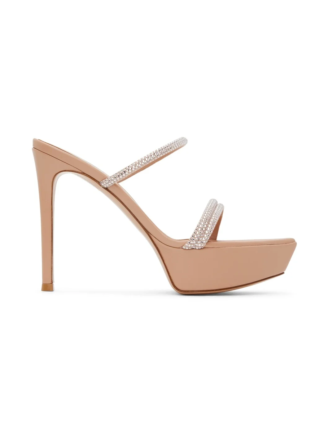 Handcrafted grained leather heeled sandals in pink. · Open pointed toe · Straps with crystal-cut detailing at vamp · Logo printed at padded leather footbed · Covered stiletto heel with rubber injection · Leather sole · Platform: H1.25 in · Heel: H4.75 in Supplier color: Peach Leather. Made in Italy 231090F125021