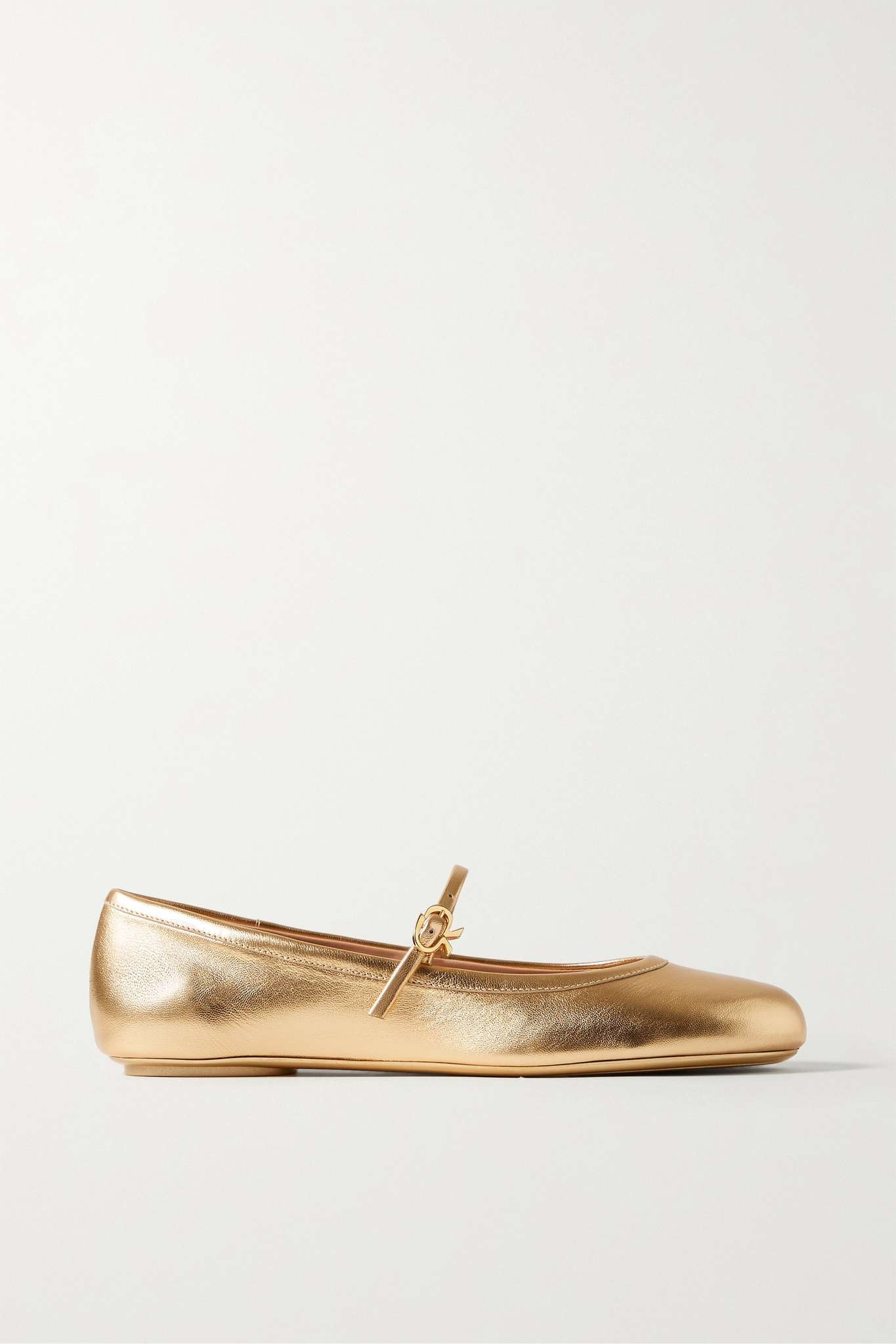 EDITORS'NOTES Few styles are quite as classic as Mary Jane flats - they're so timeless and endlessly versatile. Gianvito Rossi's 'Carla' pair have been crafted in Italy from buttery-soft gold leather and feature the designers' signature emblem at the buckle. SIZE & FIT - Fits true to size, take your normal size - Italian sizing DETAILS & CARE - Slight heel - Gold leather (Lamb) - Buckle-fastening strap