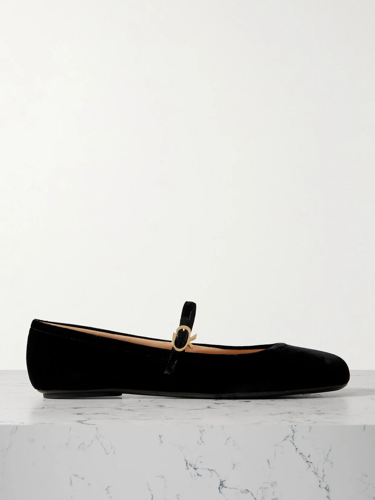 With just one glance at the gold-tone ribbon buckles, those in the know will be able to instantly recognize that these 'Carla' Mary Jane ballet flats are Gianvito Rossi's. Made from plush black velvet, they have rounded toes and slight heels.