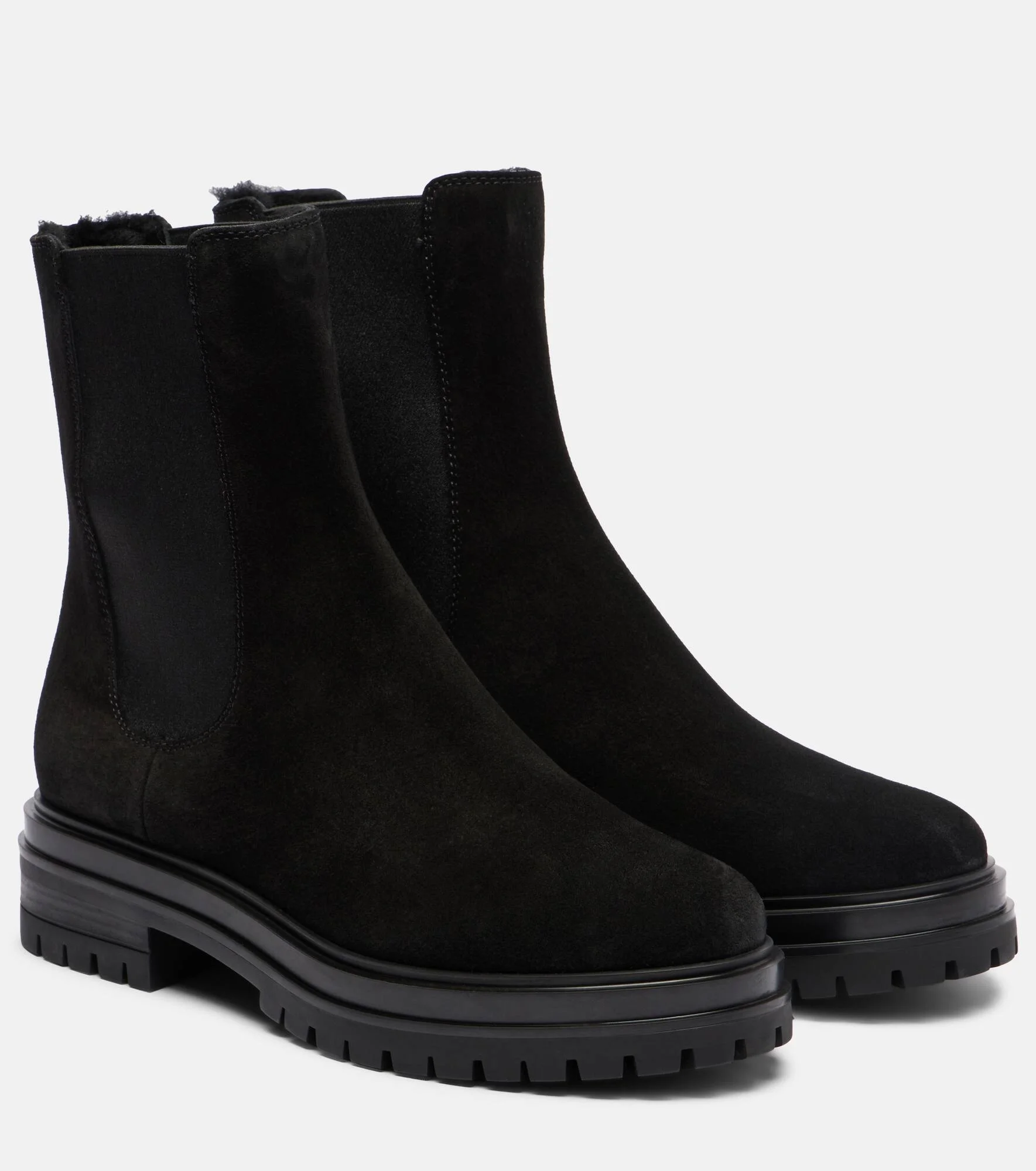 The Chelsea ankle boots from Gianvito Rossi are a timeless wardrobe essential. Handmade in Italy from smooth suede, this casual yet sophisticated pair features shearling lining, elasticated sides, and a rounded silhouette. Product Details - Upper: leather (suede) - Lining: shearling - Sole: shearling insole, rubber sole - Toe shape: round toe - Made in Italy - Includes: shoe box, dust bag - Designer color name: Black+Black - Item color: black - Item number: P01109399 Size & Fit - True to size - European sizes - 3cm-1" platform (size EU 38) - 5cm-2" wedge heel (size EU 38)