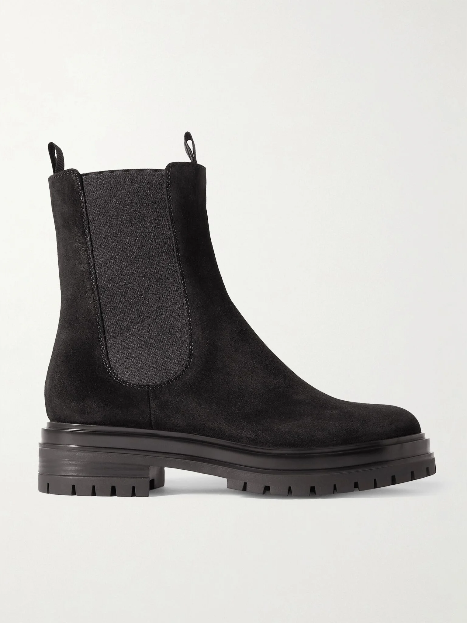Gianvito Rossi's 'Chester' Chelsea boots are about as classic as they come. Made in the brand's Italian studio from smooth black suede, they have elasticated side tabs and are set on a rubber lug sole. Wear yours with printed dresses, slip skirts and jeans alike. Size & Fit - Fits true to size, take your normal size - Italian sizing Details & Care - Heel measures approximately 45mm/ 2 inches - Black suede (Goat) - Pull on