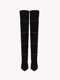 Crafted from suede, Clarice is a pointed-toe pull-on over-the-knee boot with an 85mm stiletto heel. The upper is defined by metallic-effect gold leather piping inspired by Art Deco. Handmade in Italy. - Composition: 80% SUEDE+20% NAPPA - Heel Height: 3.3 inches / 85 mm - Model Code: G80146.85RIC Item ID: G80146.85RIC.XCKNEME