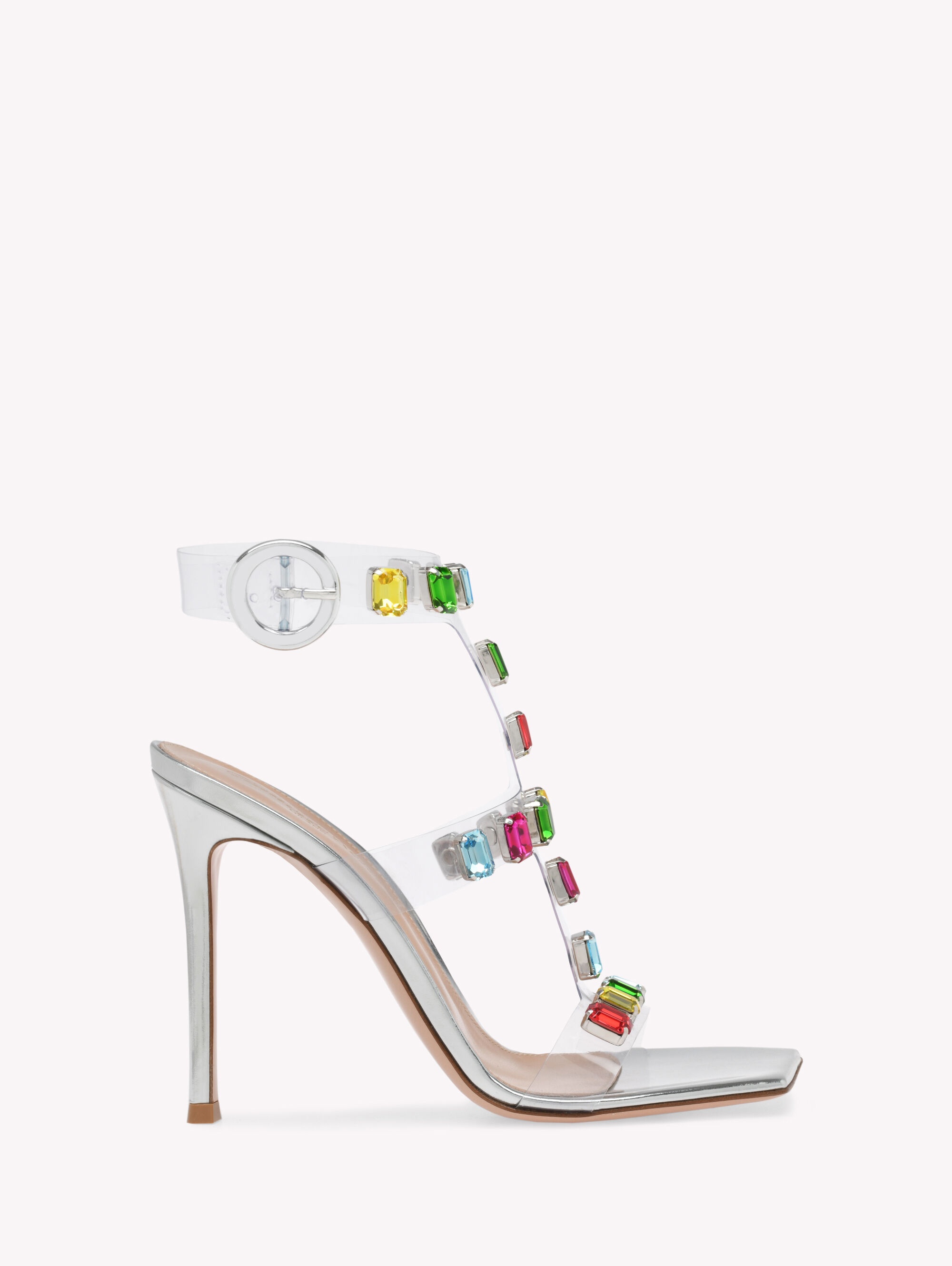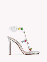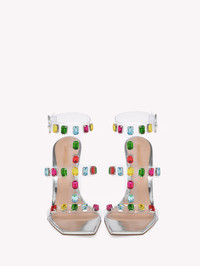 Crystal Crash is a square toe gladiator sandal enhanced by a 105mm stiletto heel. The clear Plexi upper is preciously embellished with emerald cut gemstones. The ankle strap features a metallic round buckle covered in leather. Handmade in Italy. - Composition: 100% TPU - Heel height: 105 - Model Code: G32245.15RIC Item ID: G32245.15RIC.GMETSIM