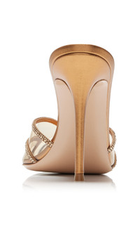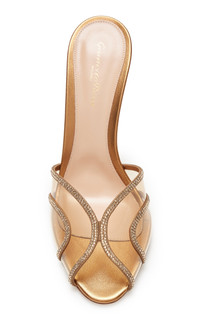 Son of Sergio, Gianvito Rossi continues the family legacy with his beautiful collection of glamorous footwear. Crafted to obsessive perfection, his shoes stem from the highest quality materials for luxurious comfort and longevity. Handmade in Italy, these mules feature a clear PVC toe strap decorated with crystal-encrusted leather. PRODUCT DETAILS - Heel height measures 95mm/ 3.75" - Slip on - Composition: PVC, leather, crystal - Designer color: Bronza/ Mekong - Made in Italy
