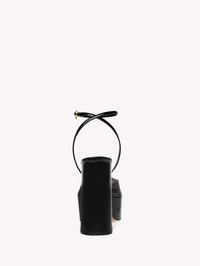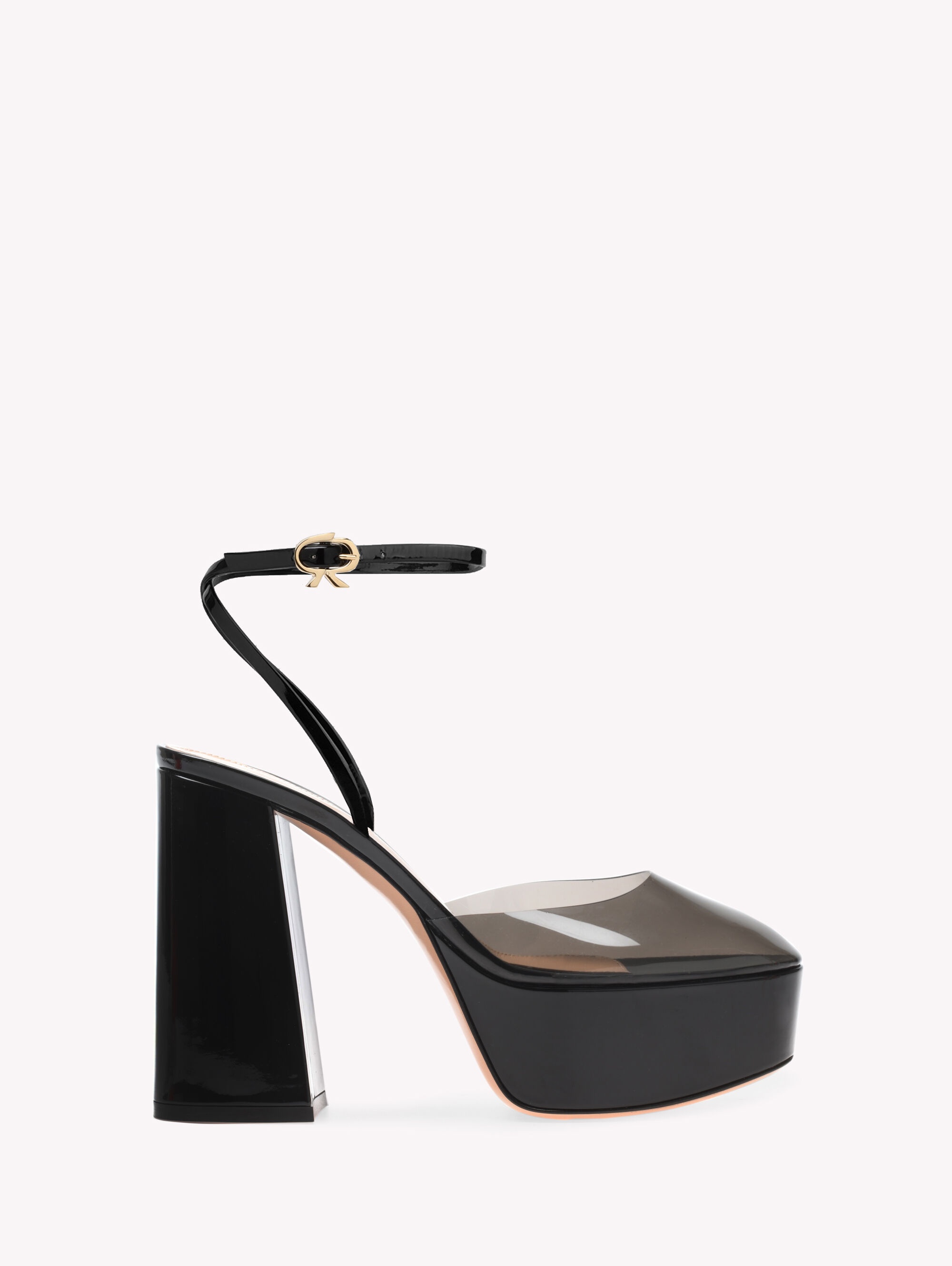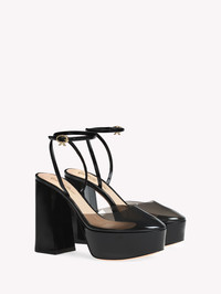 Sophistication in high demand. Dua is a statement platform pump with a rounded-toe design in Plexi and tonal patent leather. Two delicate straps, adorned with the signature gold metal Ribbon buckle, tie around the ankle, adding a graceful touch to a chunky shape. Handmade in Italy. - Heel height: 70 - Model Code: G95314.70RIC Item ID: G95314.70RIC.PXVFUNE