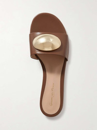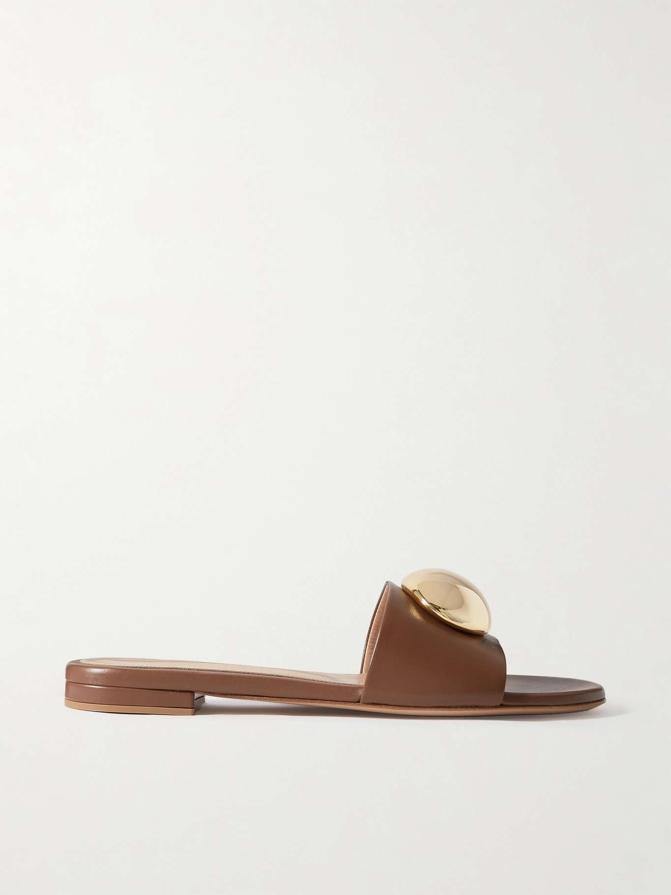 EDITORS'NOTES Gianvito Rossi's slides are embellished with gold-tone pebbles at the straps. They're crafted from supple leather and have slight heels. Wear them with anything from a floaty dress to denim. SIZE & FIT - Fits true to size, take your normal size - Italian sizing DETAILS & CARE - Slight heel - Tan leather (Calf) - Slip on