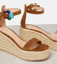 Embracing playful summer style, these platform espadrilles from Gianvito Rossi feature colorful stone-embellished buckles and round open toes. Complete with supple suede uppers, they are a perfect blend of fun and sophistication for any elevated shoe collection. Product Details - Upper: leather - Lining: leather - Sole: leather insole, rubber sole - Toe shape: round open toe - Made in Italy - Includes: shoe box, dust bag - Designer color name: Texas - Item color: brown - Closure: buckle-fastening ankle strap - Hardware color: gold - Trim: jute - Item number: P01043525 Size & Fit - True to size - Narrow straps - European sizes - 4cm-1.5" platform (size EU 38) - 9cm-3.5" wedge heel (size EU 38)