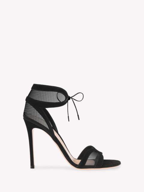 Crafted from supple suede and matching see-through mesh fabric, Falene is a round open-toe ankle-tie sandal with a 105mm stiletto heel and matching suede front lacing. The upper motif is inspired by butterfly wings. Handmade in Italy. - Heel height: 4.1 inches / 105 mm - Model Code: G61784.15RIC Item ID: G61784.15RIC.XARNENE