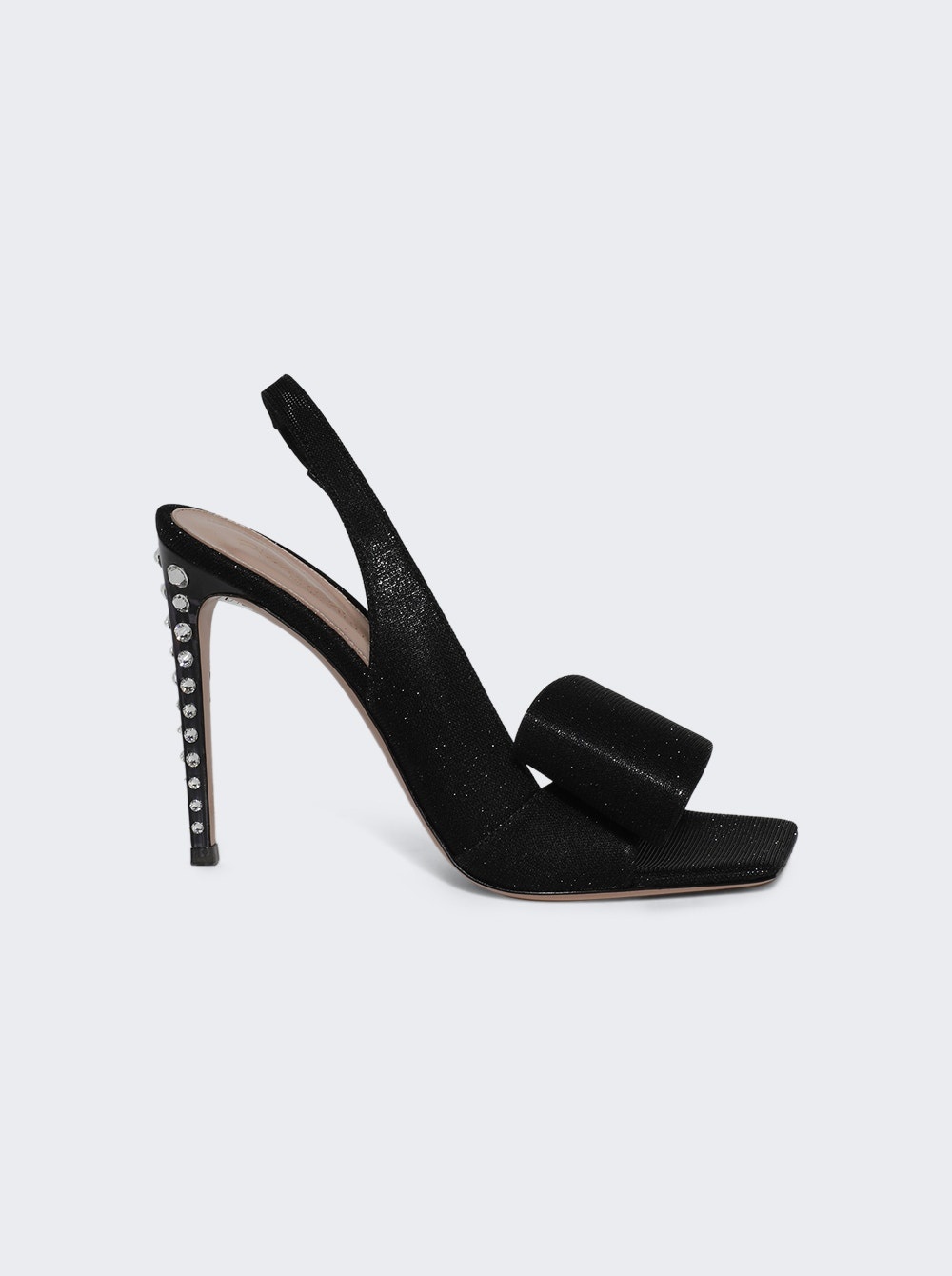 Details - High heel sandals - Shimmery fabric - Slip-on slingback style - Bow detail at toe - Crystal-adorned heel - Leather outsole and lining - Listed in EU sizing, fits true to size Brand Style: G32519.15PXS.FHXNERO Designer/Brand: GIANVITO ROSSI