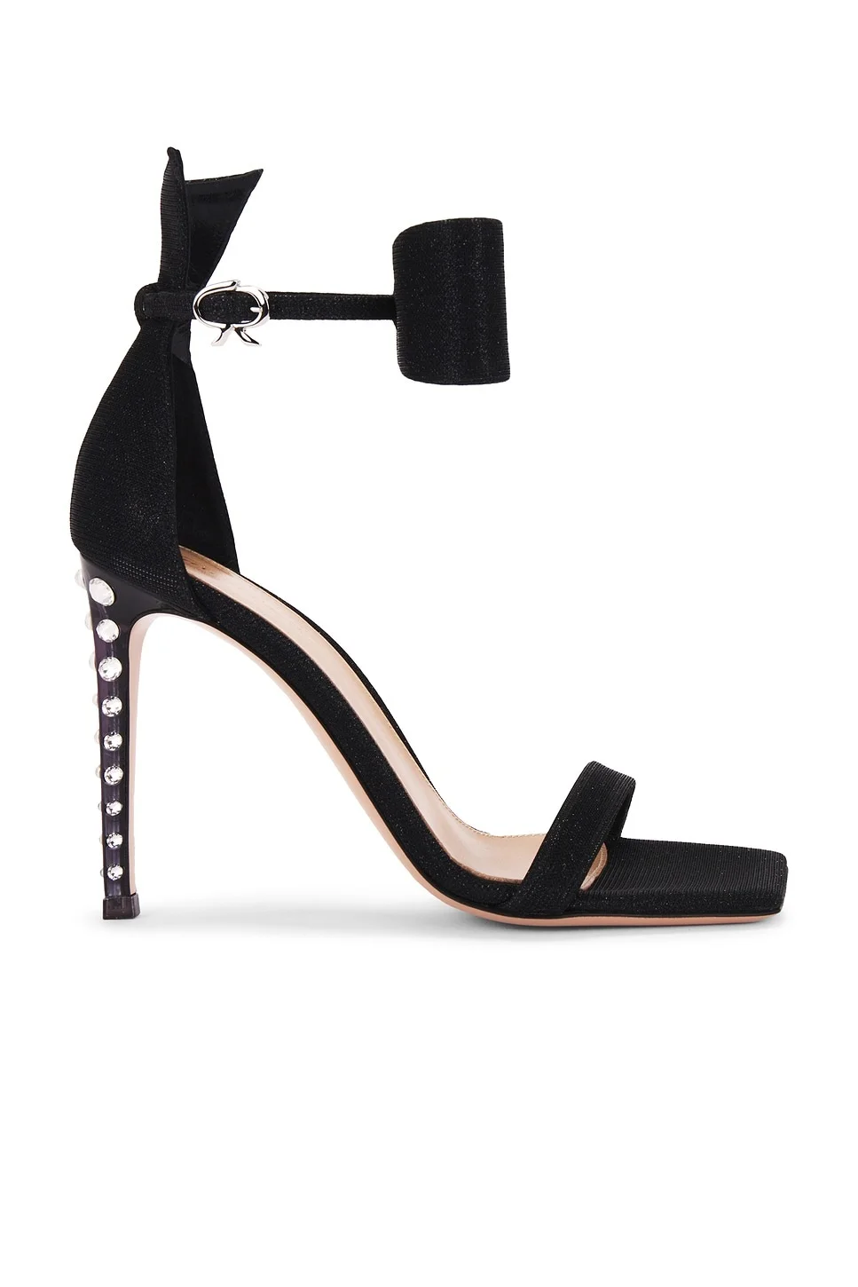 Details - Glitterized textile upper with leather sole - Made in Italy - Adjustable ankle buckle closure - Leather footbed and lining - Ankle bow embellishment - Angled square toe with stiletto heel - Approx 100mm/ 4 inch heel - Our Style No. GIAN-WZ768 - Manufacturer Style No. G61731-15PXS-FHX