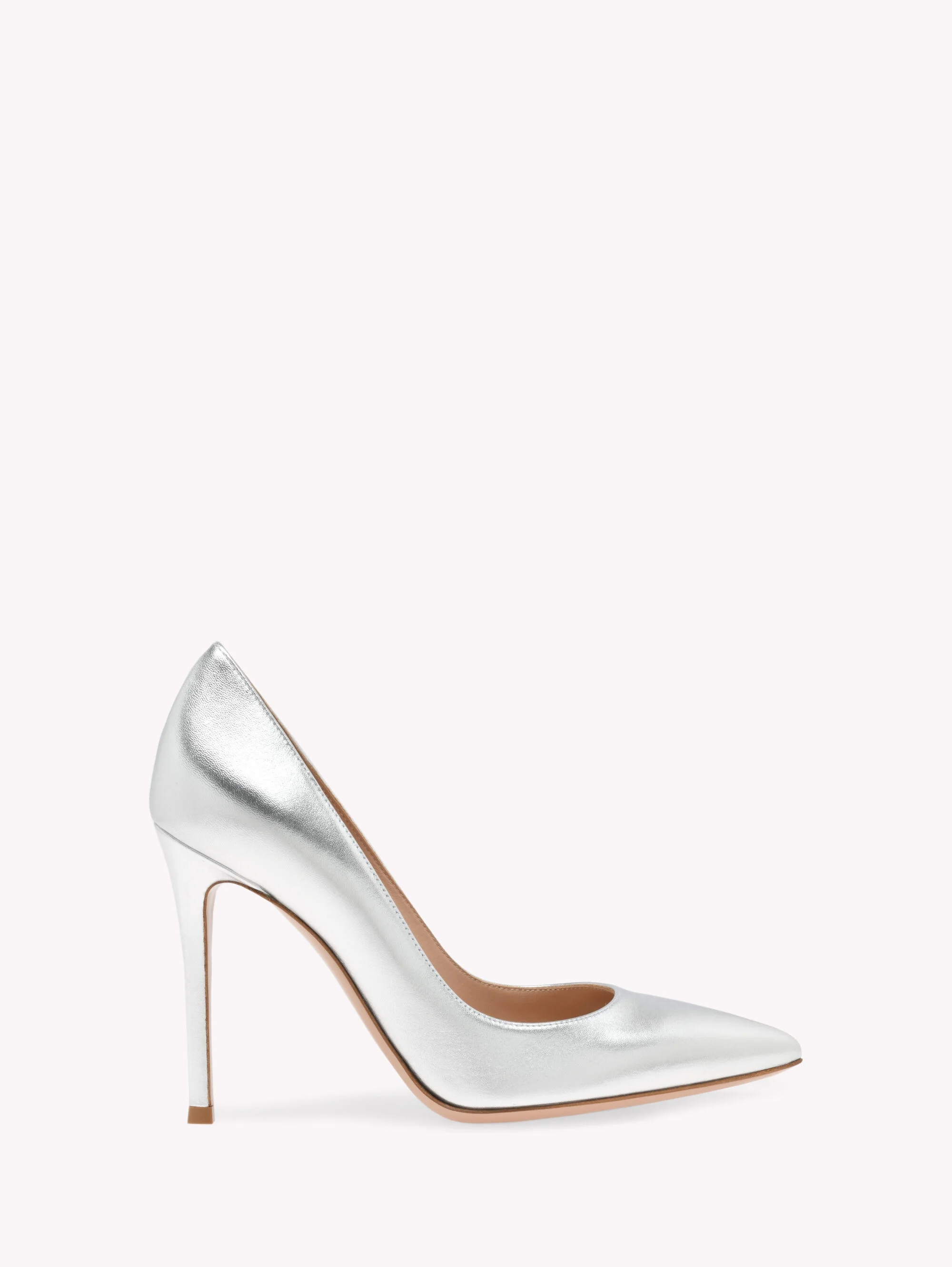 The iconic Gianvito pump in glimmering Silver metallic is our ultimate signature style reflecting elegance and femininity. Standing on a stiletto heel of 105mm, this timeless pointy toe is neatly designed with pure proportions and thus wearable with any outfit from casual skinny pants to cocktail dresses. - Composition: 100% NAPPA - Heel height: 105 - Model Code: G28470.15RIC Item ID: G28470.15RIC.NPSARGE