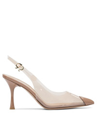 Gianvito Rossi "Diana 85 mm" slingbacks with an upper made of leather and transparent plexi. The silhouette is defined by a slender structure, characterized by an hourglass heel and a metal insert placed in the toe area. The model integrates an adjustable back strap, enriched by the Ribbon buckle, a distinctive element of the brand. The construction is essential, with finished edges and materials selected for strength and comfort. || - Leather and transparent plexi upper - Metallic insert on the toe - Adjustable back strap with Ribbon buckle - Hourglass heel - Leather sole - Craftsmanship Extra Description: High Gender: Women Material: 100% POLYURETHANE - 100% LEATHER Color: Beige Made in: Italy Product ID: G9554285LACPRALINE+PRALINE *Import tax/duty will be calculated at checkout (If applicable)