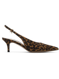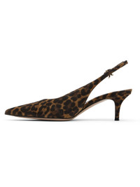 Handcrafted suede heels. · Leopard pattern printed throughout · Pointed toe · Pin-buckle slingback strap · Buffed leather lining · Covered stiletto heel with rubber injection · Leather sole · Heel: H2.25" Supplier color: Leopard Upper: leather. Sole: leather, rubber. Made in Italy 252090F122019