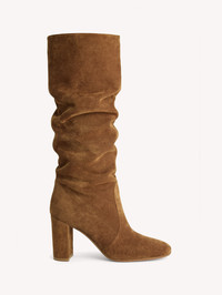 Crafted from supple suede, Glen is a round toe boot with an 85mm block heel. The boot shaft is gently ruffled, ensuring an easy fit. Handmade in Italy. - Composition: 100% SUEDE - Heel Height: 3.3 inches / 85 mm - Model Code: G80627.85RIC Item ID: G80627.85RIC.C45TEXA