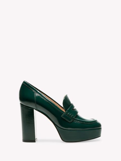 Crafted from soft glossy leather, Hadden is a round toe penny bar moccasin with a 30mm platform and a 105mm chunky heel. The platform is completed with a rubber sole at the front. Handmade in Italy. - Composition: 100% NAPPA - Heel Height: 2.8 inches / 70 mm - Model Code: G25356.70RIC Item ID: G25356.70RIC.NUIMOKA