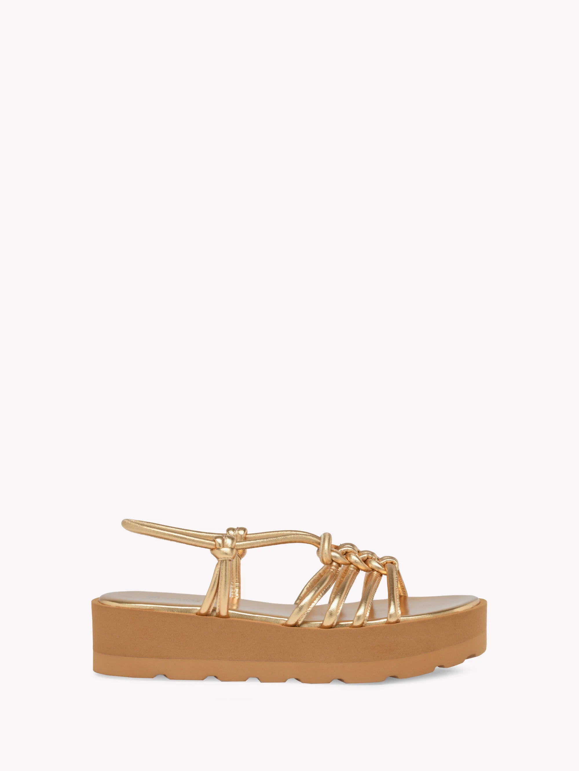 Crafted from metallic-effect leather, Hebe is a round toe sandal with a knotted cage upper. The flatform sole measures 55mm at the back of the heel. The round tubular elastic ankle strap covered in leather ensures easy wearability. Handmade in Italy. If you wish to return a product, you can return it for free within 30 days of the reception of your order. Please return the items in the same condition in which they were received, including dustbag, box and protective stickers. Incomplete, damaged, worn or altered items cannot be accepted as stated in our Terms and Conditions . Standard shipping FREE (3-5 business days) Express shipping $60 (1-3 business days) Deliveries are made from Monday to Friday between 9:00 a.m. and 6:00 p.m. The time frame for delivery is calculated from the time your order is dispatched, not from the time your order was placed. Please check our Shipping page for further information. - Composition: 100% NAPPA - Heel height: 0.2 inches / 5 mm - Model Code: G32522.05GOM Item ID: G32522.05GOM.NPSMEKO
