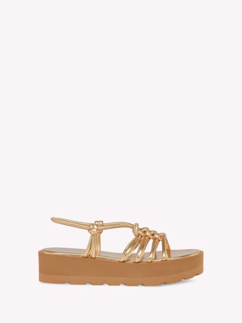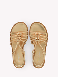 Crafted from metallic-effect leather, Hebe is a round toe sandal with a knotted cage upper. The flatform sole measures 55mm at the back of the heel. The round tubular elastic ankle strap covered in leather ensures easy wearability. Handmade in Italy. - Composition: 100% NAPPA - Heel Height: 0.2 inches / 5 mm - Model Code: G32522.05GOM Item ID: G32522.05GOM.NPSMEKO