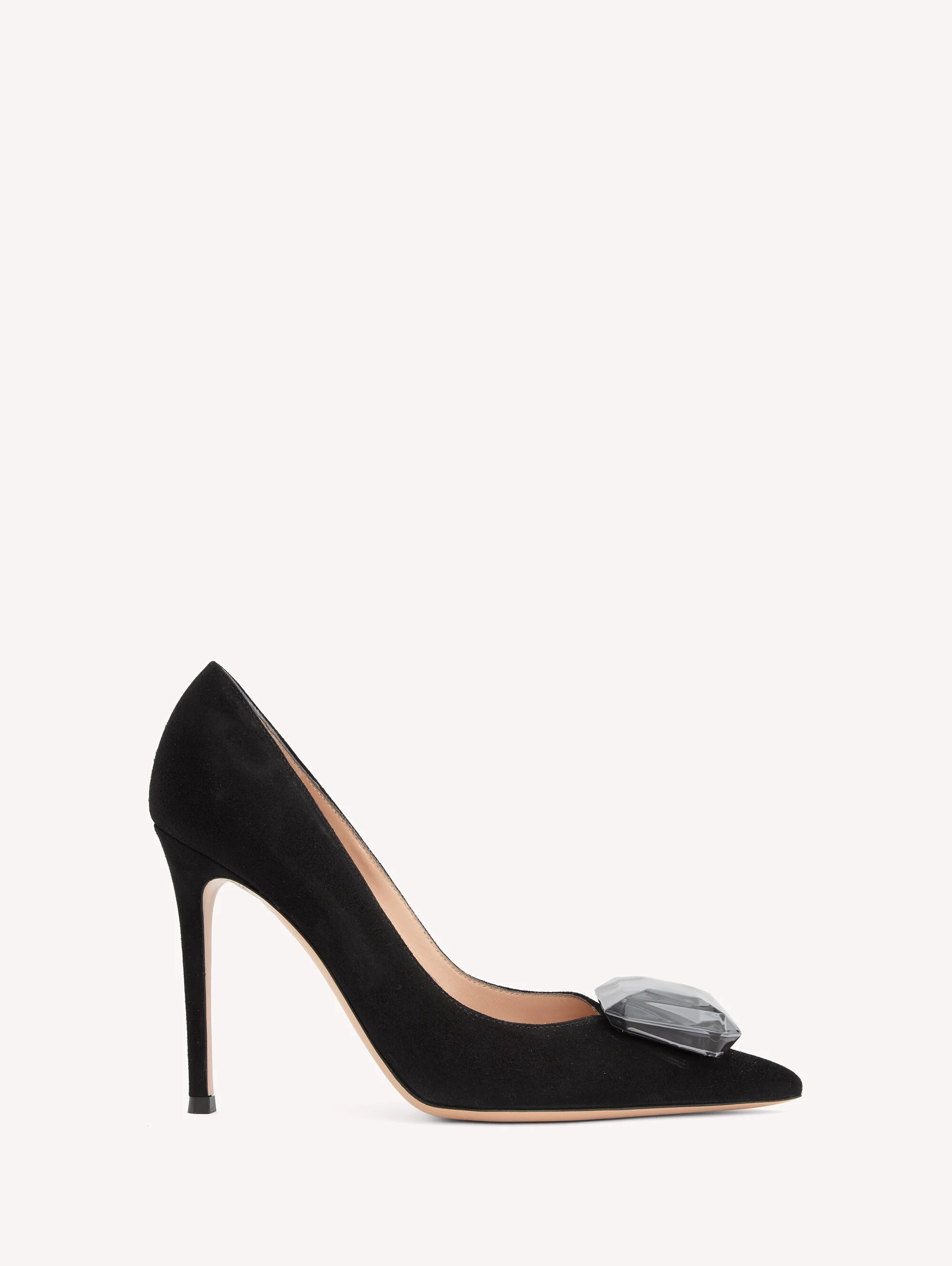 Vibrant shades define the precious allure of the Jaipur pointy pump. Its exquisitely feminine silhouette is characterised by the sleek 105mm stiletto heel and the custom-made maxi gemstone. Crafted by our expert artisans, the stone is conceived as a timeless detail confirming the minimalistic yet elegant essence of the brand. Handmade in Italy. - Composition: 100% SUEDE - Heel height: 105 - Model Code: G22141.15RIC Item ID: G22141.15RIC.CAMNERO