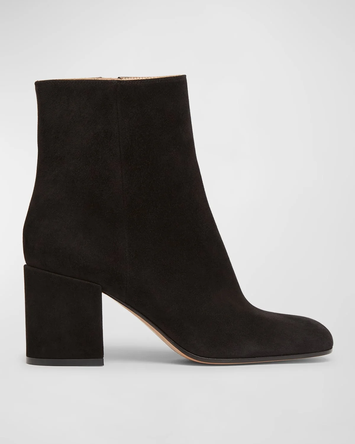 Gianvito Rossi "Joelle" suede ankle booties 2.75 in / 70 mm block heel Round toe Side zip eases dress Smooth sole Made in Italy