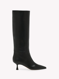 Crafted from leather, Joyce is a pointed-toe pull-on knee boot with a tonal lacquered 55mm flare kitten heel. Handmade in Italy. - Composition: 100% CALF - Heel Height: 2.2 inches / 55 mm - Model Code: G80183.55LAC Item ID: G80183.55LAC.VGINERO