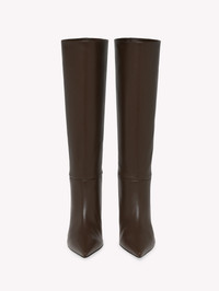 Crafted from leather, Joyce is a pointed-toe pull-on knee boot with a tonal lacquered 55mm flare kitten heel. Handmade in Italy. - Composition: 100% CALF - Heel height: 2.2 inches / 55 mm - Model Code: G80183.55LAC Item ID: G80183.55LAC.VGIBROW