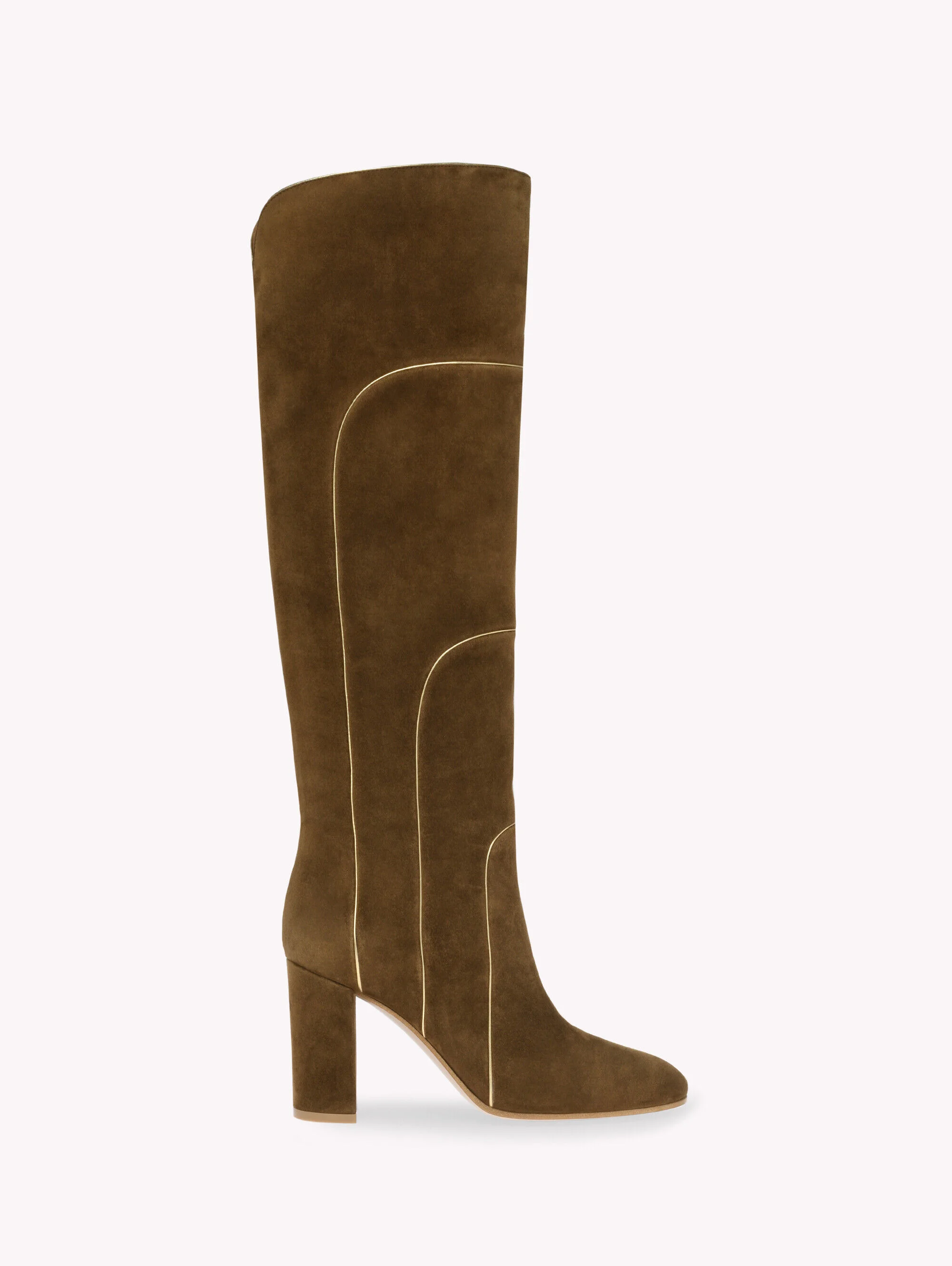 Crafted from suede, Juliette is a round toe pull-on boot with an 85mm chunky heel. The sinuous upper is elegantly defined by metallic-effect gold leather piping inspired by Art Deco. Handmade in Italy. - Composition: 80% SUEDE+20% NAPPA - Heel Height: 3.3 inches / 85 mm - Model Code: G80147.85RIC Item ID: G80147.85RIC.4NSTEME
