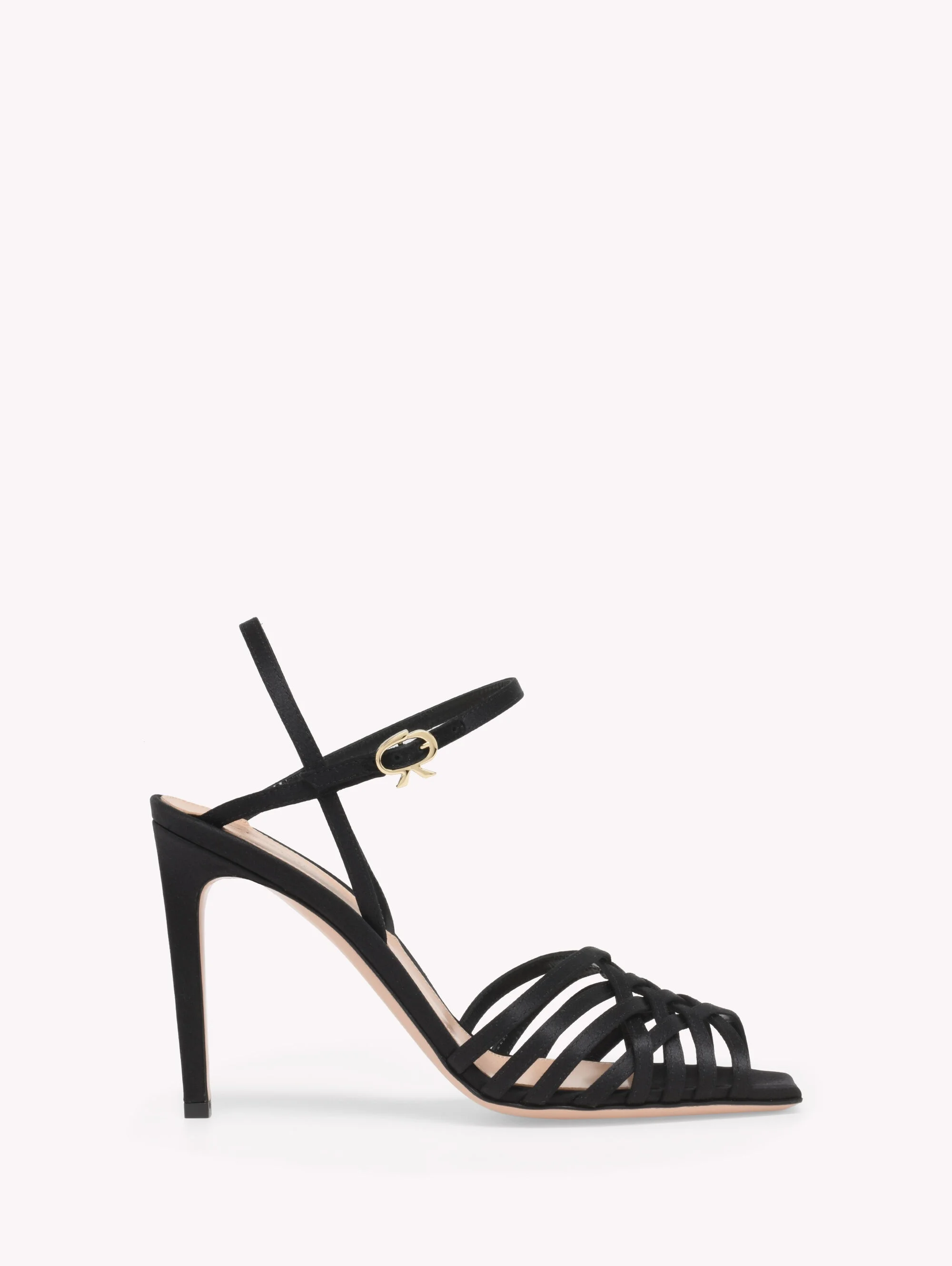Crafted from precious satin, Kerry is a square open-toe sandal with a 95mm geometric stiletto heel. The multistrap upper presents a woven criss-cross motif. The ankle strap is embellished with the signature Ribbon buckle. Handmade in Italy. - Composition: 100% FABRIC - Heel height: 3.8 inches / 95 mm - Model Code: G32629.95RIC Item ID: G32629.95RIC.CRENERO