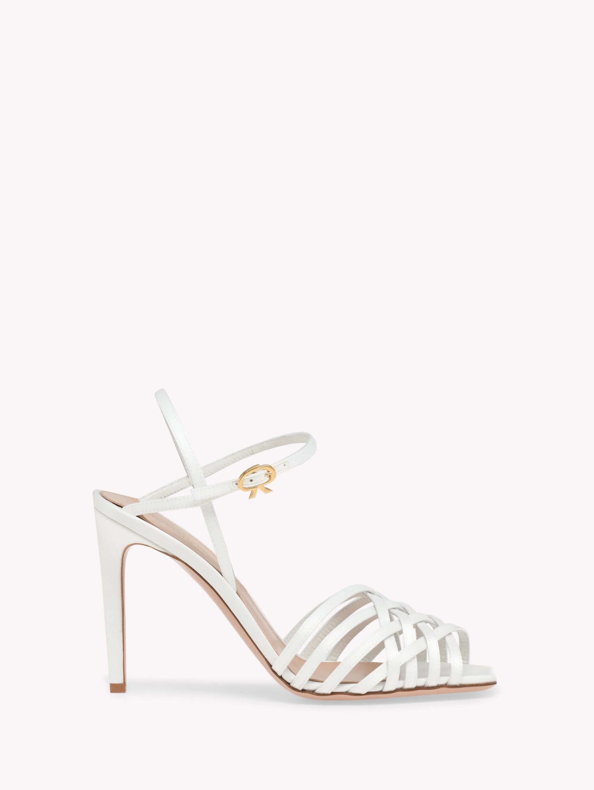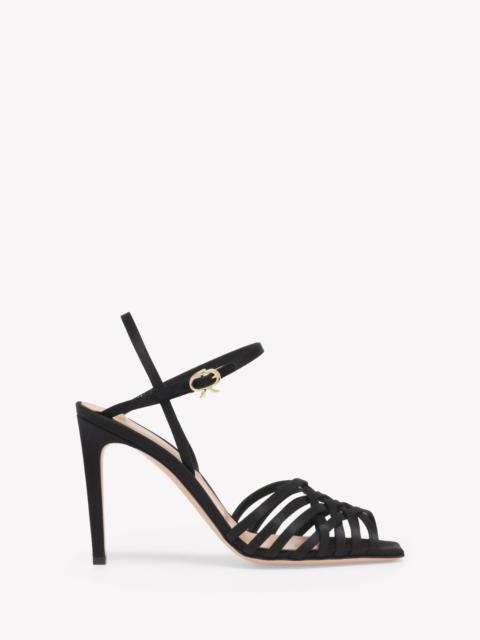 Crafted from precious satin, Kerry is a square open-toe sandal with a 95mm geometric stiletto heel. The multistrap upper presents a woven criss-cross motif. The ankle strap is embellished with the signature Ribbon buckle. Handmade in Italy. - Composition: 100% FABRIC - Heel height: 3.8 inches / 95 mm - Model Code: G32629.95RIC Item ID: G32629.95RIC.RASBIAN
