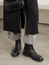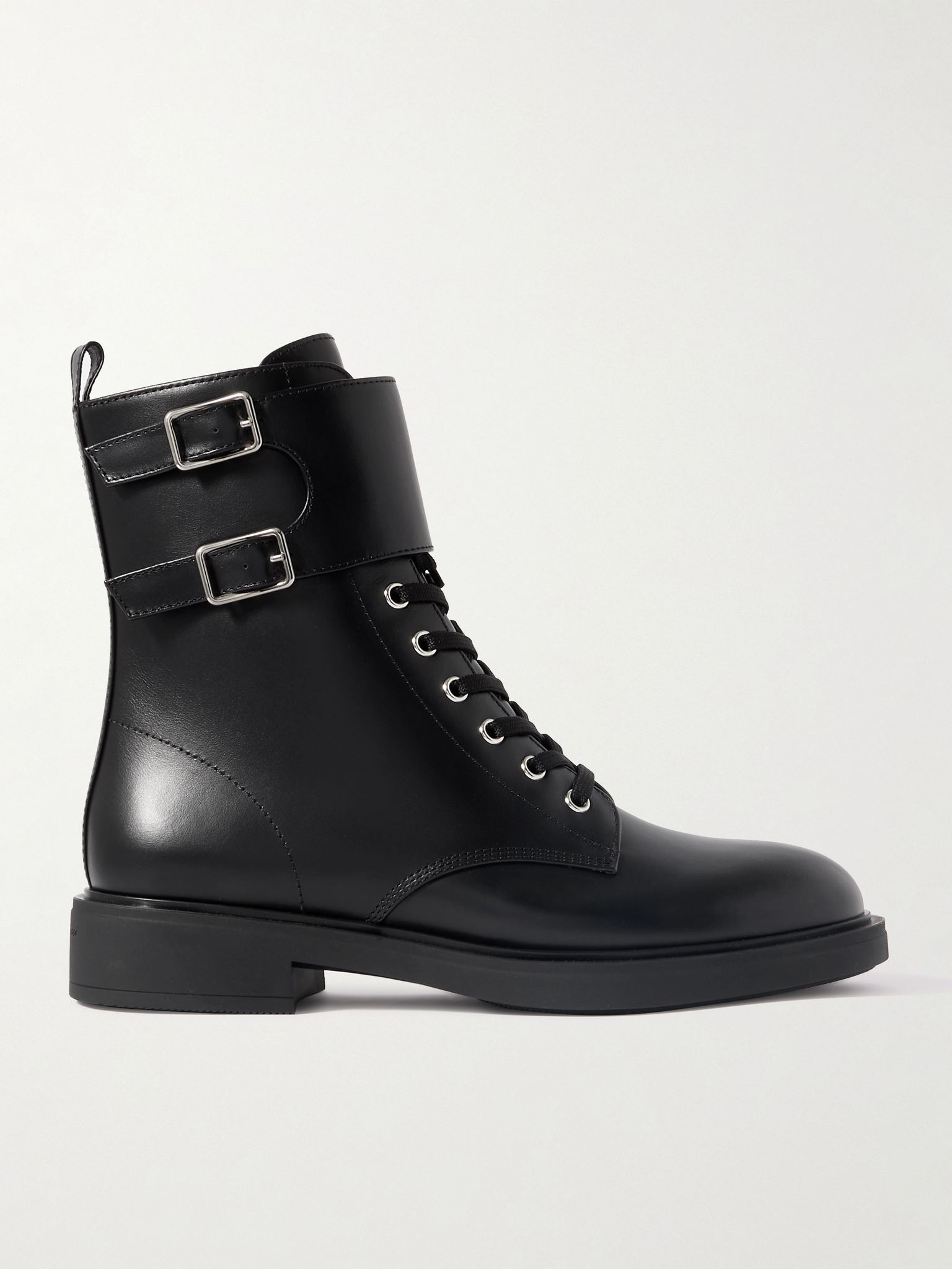 Gianvito Rossi's ankle boots are a spin on classic biker styles in an elegant, streamlined profile. Set on a slight heel, they're made from leather and have a buckled latch across the lace-up front. They're a cool way to pare down a dress. Size & Fit - Fits true to size, take your normal size - Only available in full sizes, go up to the nearest whole size if you take a half size - Italian sizing Details & Care - Heel measures approximately 20mm/ 1 inch - Black leather (Cow) - Zip fastening along side