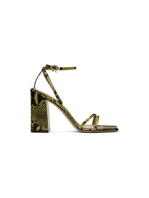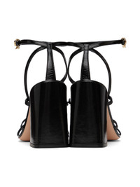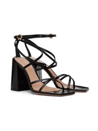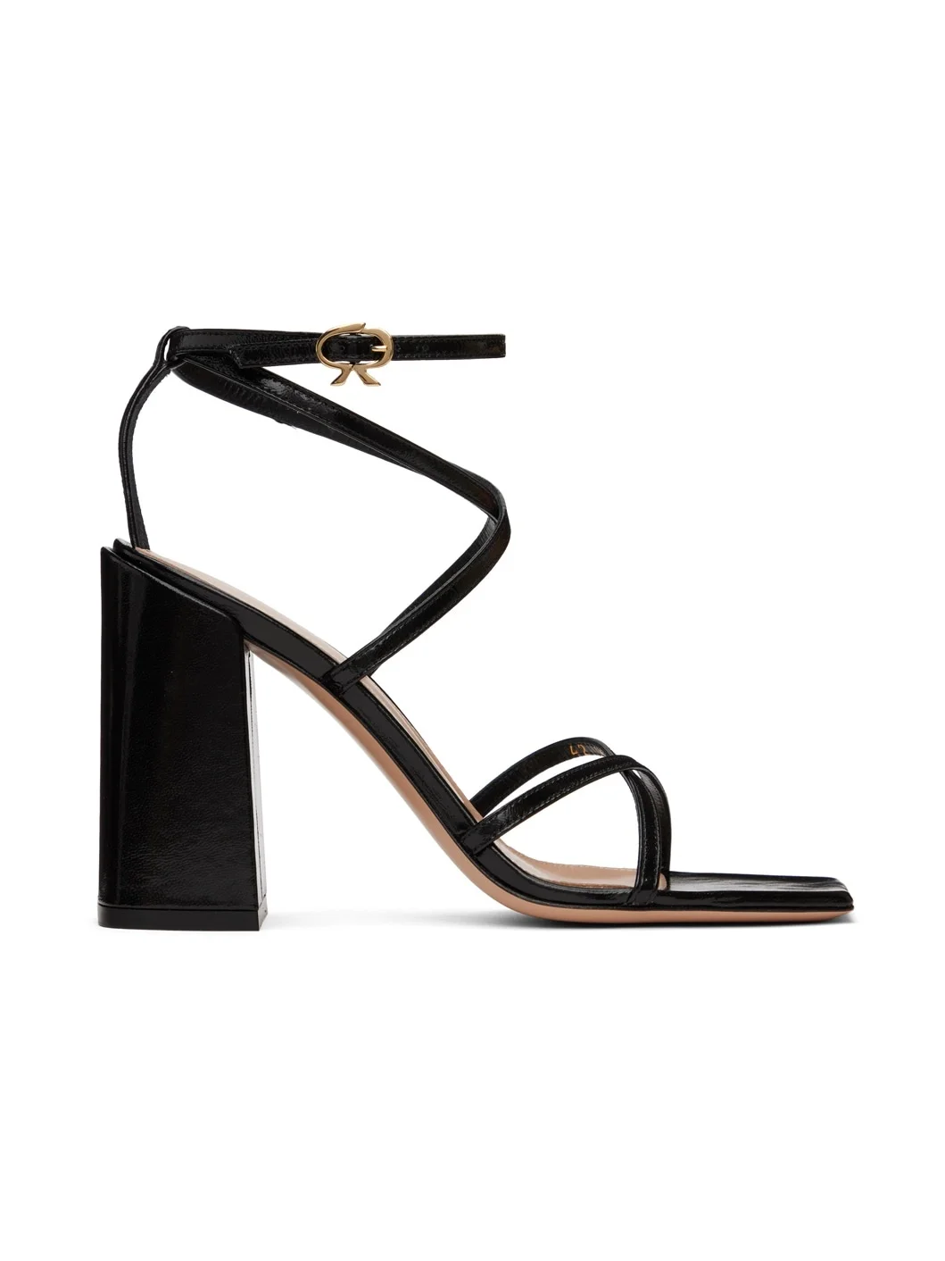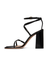 Polished leather heeled sandals in black. · Open square toe · Criss-crossing straps at vamp · Adjustable pin-buckle ankle strap · Padded leather footbed · Covered block heel with rubber injection · Leather sole · Heel: H4" Supplier color: Black Upper: leather. Sole: leather, rubber. Made in Italy 241090F125016